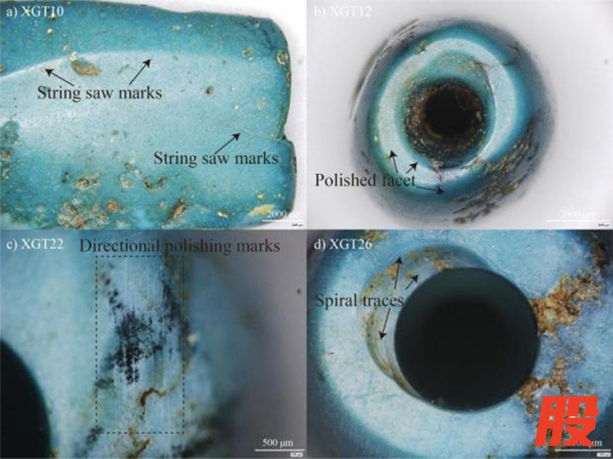 此外,研究人员还应用便携式X射线荧光光谱、傅里叶变换红外光谱与光纤反射光谱等非破坏性技术,快速获取绿松石样品的成分与颜色信息,并结合光学显微镜与扫描电镜对样品表面特征和加工痕迹进行观察,“比如我们能在样品内壁看到钻具高速形成的细密螺纹,内壁较直,孔径略大于孔心。”杨菊指着一张绿松石样品高清扫描图片说,“这些复杂工艺痕迹说明古人已掌握较高水平的珠饰制作技术。”